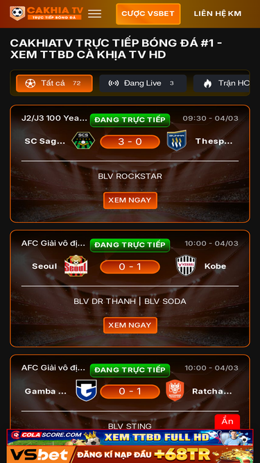CakhiaTV trực tiếp bóng đá Full HD, link nhanh, miễn phí, không giật lag. Xem mọi giải đấu lớn nhỏ: EPL, C1, La Liga, Serie A, V-League, hỗ trợ mọi thiết bị.