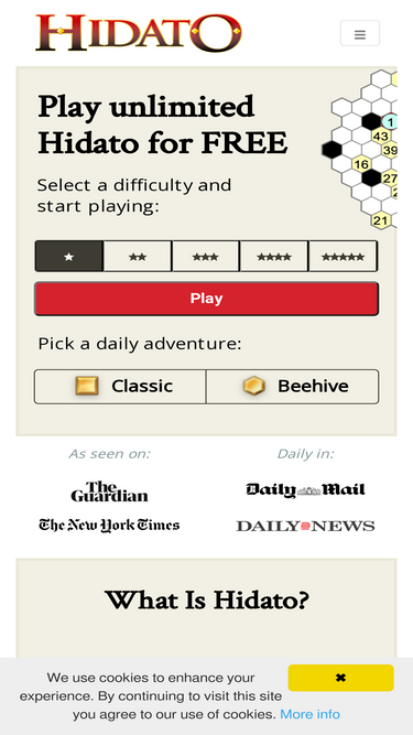 play unlimited hidato for free. hidato is a logic puzzle game invented by dr. gyora m. benedek, an israeli mathematician. the goal of hidato is to fill the grid with consecutive numbers that connect horizontally, vertically, or diagonally.