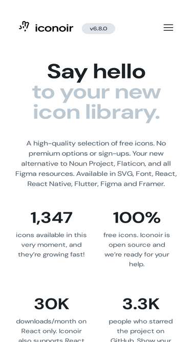 Iconoir is the biggest open source icon library that provides a massive selection of high-quality icons, available for free download. No premium options or email sign-up required, free for real. Icons available in SVG, Font, React, React Nativ, and Flutter libraries, Figma and Framer.