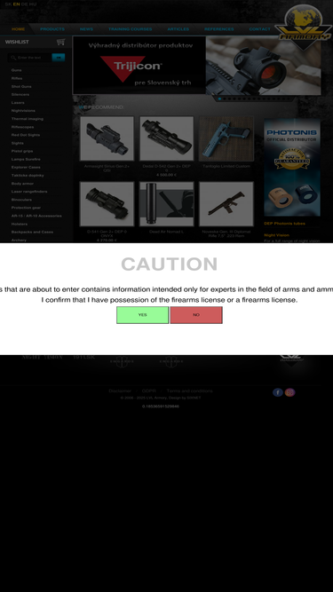 100%široký výber krátkych a dlhých zbraní, nočného videnia, puškohľadov, binokulárov, kolimátorov, laserových zameriavačov, prvkov balistickej ochrany a taktických doplnkov.