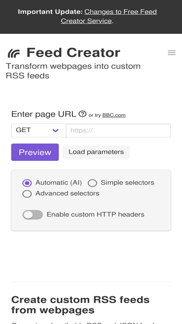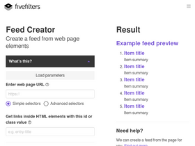 71%Web to RSS Generator. Create custom feeds from webpages. Generate subscribable RSS and JSON feeds from any set of items or links on a web page. Filter and merge feeds.