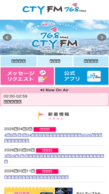 89%三重県四日市市にあるコミュニティエフエム局。CTY-FM(シー・ティー・ワイ エフエム)。番組表をはじめ、各番組の紹介・プレゼント情報など盛りだくさん!主なエリアは四日市市・菰野町を中心とした三重県北勢地域。周波数は76.8MHz。