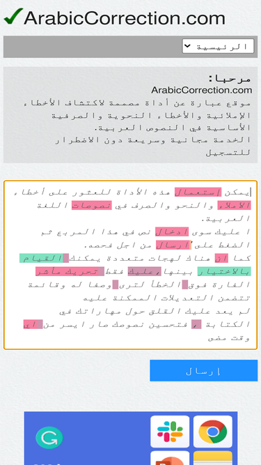 100%فحص مجاني أونلاين لاكتشاف أخطاء الإملاء والنحو والصرف.