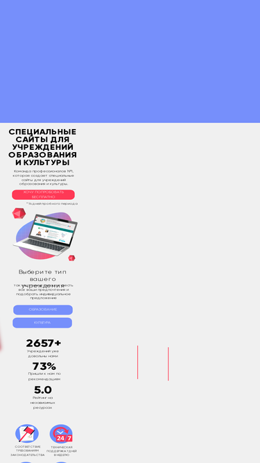73%Создайте специальный сайт для вашего учреждения с нашей профессиональной командой. Мы экономим время и нервы, решая все технические вопросы, и делимся опытом через вебинары и обновления по требованиям к официальным сайтам