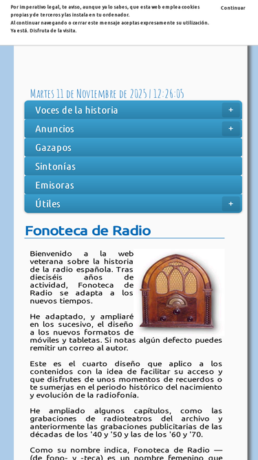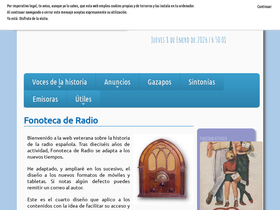 86%página que contiene documentos sonoros de la historia de la radio en españa. dispone de una base de datos para consultar sobre los personajes populares de la radiofonia española. en la fonoteca de radio encontrarás todos los datos interesantes sobre la radio en españa y sus personajes.