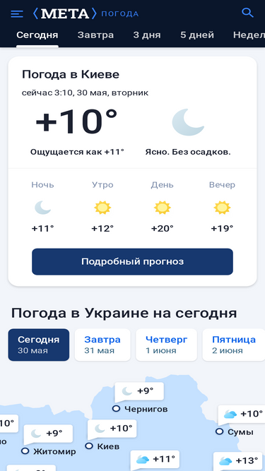 98%Погода в Україні на сьогодні, завтра, тиждень, прогноз погоди по містах України на місяць. Детальний прогноз погоди для Вашого міста від METEO.UA™