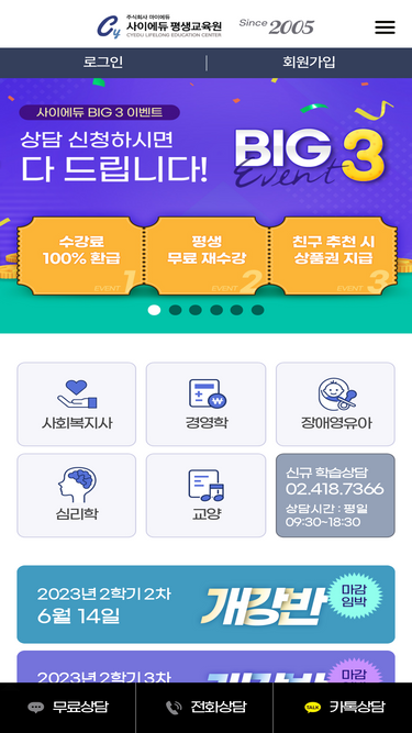49%Since2005 교육부평가인정,원격교육기관,학점은행제,사회복지사2급, 장애영유아를위한보육교사, 심리학학위, 산업기사/기사 응시자격대비, 경영학학위, 학사학위, 교양과정, 민간자격증 취득, 상시 이벤트진행