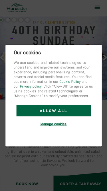 Home of the famous salad bar, Harvester is the UK's favourite family restaurant. Book today and enjoy our menu complete with grills & rotisserie chicken.