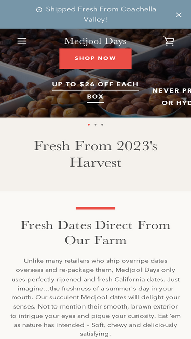 SUBSCRIPTION PROCESS, RENEWAL, CANCELLATION, SHIPPING, BILLING & REFUNDS Currently, we only ship to addresses within the continental US. If you purchase a subscription to Medjool Days through our Site, you will receive an initial package with your supply of dates or date-related products, then according to your cho