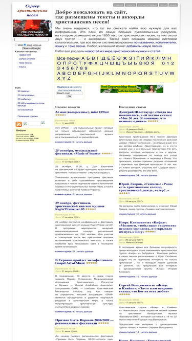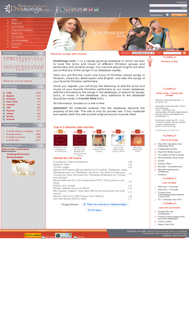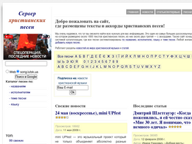 99%самый большой русскоязычный ресурс на котором размещено около 1500 текстов христианских песен, из них более тысячи с аккордами. также сайт оснащен мощной системой каталогизации, где все песни систематизированы по названию, исполнителю, языку и теме песни. любой желающий может добавить новую песню. работают разделы новости христианской музыки и статей, интервью.