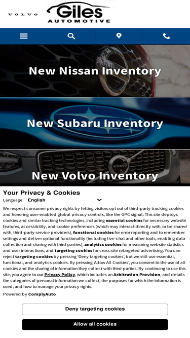 82%visit us at giles automotive in lafayette for your new or used nissan, subaru or volvo car. our dealerships provide a comprehensive inventory with finance specials and lease deals near new iberia, youngsville, broussard and breaux bridge. online car shopping with vehicle delivery now available!