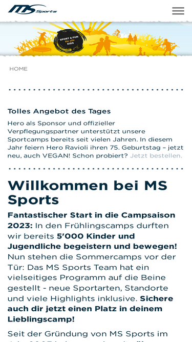 57%Ob im Fussball, Reiten, Tanzen, Racket, Biken, Schnee- oder Polysport, Outdoor oder Gaming & Sport - bei MS Sports erwartet die Kinder und Jugendlichen ein tolles Erlebnis mit vielen neuen Freunden und unvergesslichen Tagen im Zeichen des Sports. Für über 20'000 Kids bietet MS Sports schweizweit jährlich über 400 Camps sowie weitere tolle Events an und ermöglicht den Kindern und Jugendlichen eine sinnvolle Ferienbeschäftigung im Zeichen von Spass und Bewegung. Wann und wo dürfen wir Ihr Kind begrüssen? Alle Infos (Daten, Standorte) finden Sie auf www.mssports.ch. Wir freuen uns auf Sie!