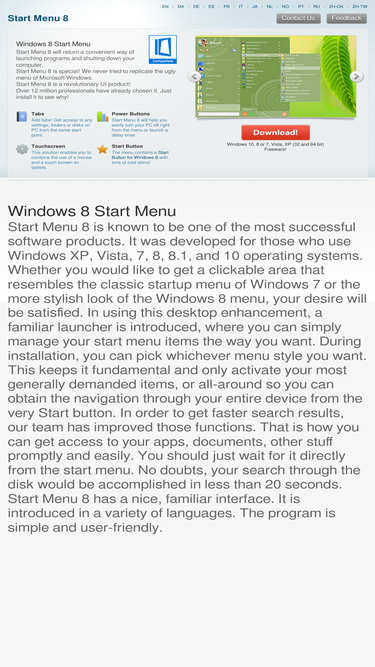 start menu 8 for windows 8 will return a convenient way of launching programs and shutting down your pc. allows users to skip metro.