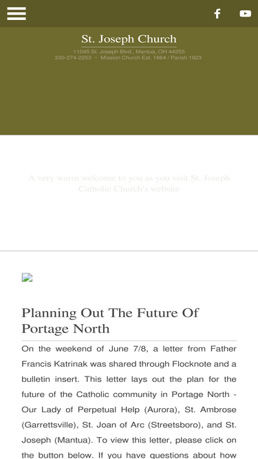100%st. joseph catholic church, 11045 st. joseph blvd, mantua, ohio 44255, a parish of the catholic diocese of youngstown, ohio. located in northern portage county. proud home of the ox roast fair!