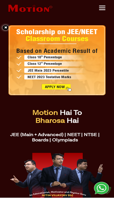76%Join Motion Education, India’s Top Coaching Center in Kota. Provide Offline/Online Classroom Coaching Classes for IIT JEE Main & Advanced, NEET (UG), Olympiad