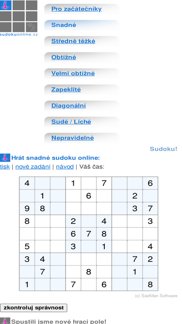 92%hraj sudoku online! vyber si zdarma: sudoku pro začátečníky, snadné, středně obtížné, velmi obtížné, diagonální. obsahuje také návod, novinky, informace o hře...