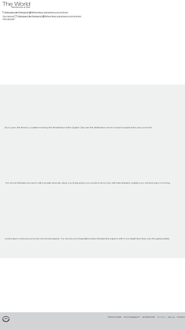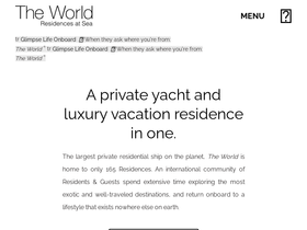 100%the world is the only private residential community-at-sea where its residents may travel the globe without ever leaving home. since it first set sail in 2002, the world has visited over 800 ports in approximately 140 countries.
