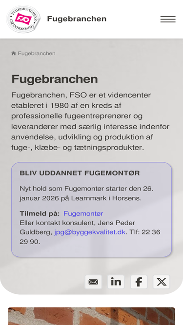 fugebranchen, fso, er et videncenter etableret i 1980 af en kreds af professionelle fugeentreprenører og leverandører med særlig interesse indenfor anvendelse, udvikling og produktion af fuge-, klæbe- og tætningsprodukter.