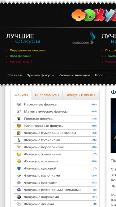 49%здесь вы научитесь делать карточные фокусы, фокусы с монетами, сможете посмотреть видео фокусов. вы найдете множество описаний фокусов, которые помогут произвести впечатление на ваших друзей и знакомых!