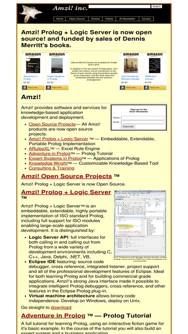 100%amzi! inc. provides software and services for embedding intelligent components that apply busines rules, diagnose problems, recommend configurations, give advice, schedule events, monitor processes and more.