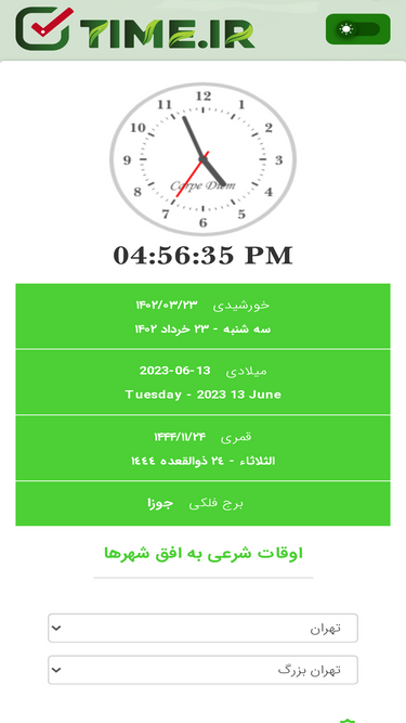 100%ساعت و تقویم ایران، اوقات شرعی نقاط مختلف ایران، مناسبتهای روز و تبدیل تاریخ شمسی به میلادی، محاسبه سن از امکانات سایت تایم است.