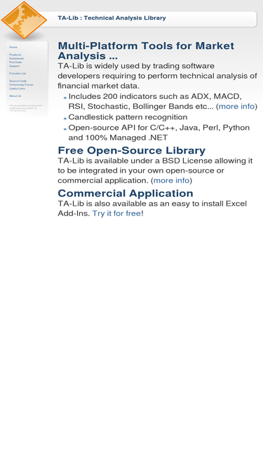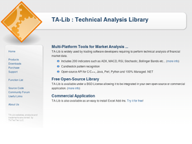 technical analysis open-source software library to process financial data. provides rsi, macd, stochastic, moving average... works with excel, c/c++, java, perl, python and .net