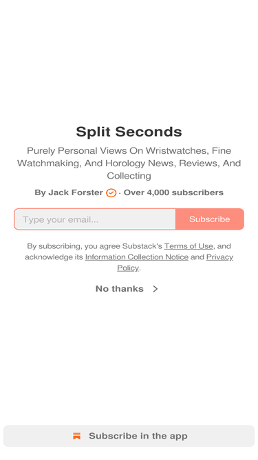 purely personal views on wristwatches, fine watchmaking, and horology news, reviews, and collecting. click to read split seconds, by jack forster, a substack publication with thousands of subscribers.