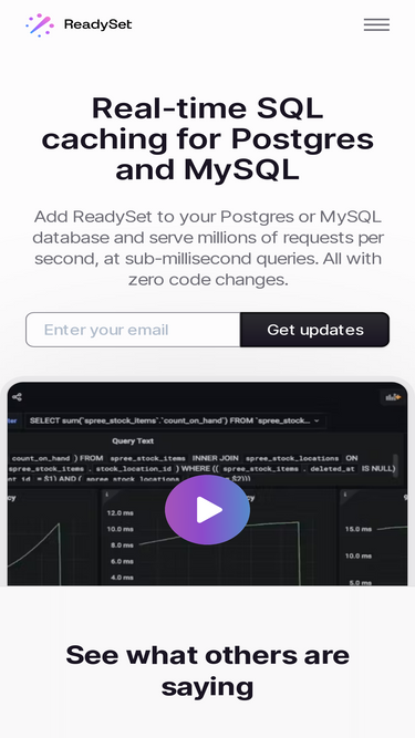 89%Increase the scale of your PostgreSQL and MySQL deployment by up to 100x with Readyset - all without modifying your application code or database. Start using Readyset today for free!