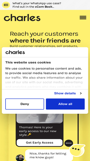 79%Automate FAQs 24/7 with charles. AI-powered answers on WhatsApp, Instagram, and Webchat in your brand voice. Boost efficiency with enterprise-grade safety.