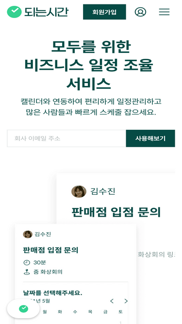 95%내가 되는시간에 상대방이 예약할 수 있어요. 일정 관리를 자동화하여 업무 효율성을 높여보세요. 지금 가입하면 무료로 사용 가능합니다.