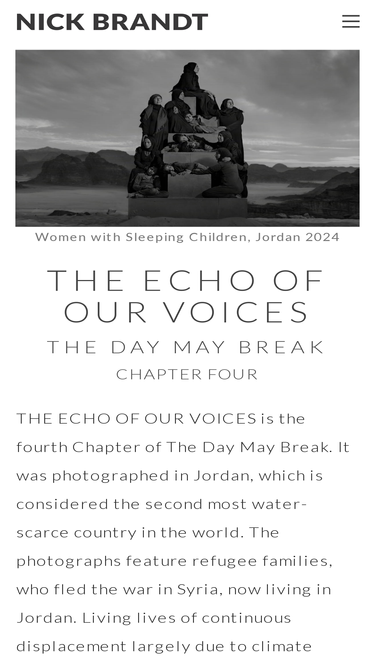 82%Nick Brandt's photographs focus on the impact of environmental destruction and climate breakdown, for both some of the most vulnerable people across the planet and for the animal and natural world. Books/projects: SINK / RISE; The Day May Break: Chapter Three (2024); The Day May Break: Chapter Two (2023); The Day May Break: Chapter One (2021), This Empty World, Inherit the Dust, On This Earth, A Shadow Falls, Across The Ravaged Land. Solo exhibitions worldwide.
