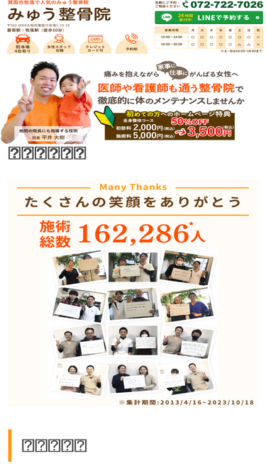 78%大阪箕面市で腰痛、肩こり、ヘルニア、頭痛でお困りの方に対して整体をしている、みゅう整骨院です。腰痛、肩こり、ヘルニア、頭痛の原因に対して整体をしており、箕面市だけでなく豊中市、池田市、吹田市、大阪市外、他府県からも腰痛、肩こり、ヘルニア、頭痛でお困りの方が整体を受けに来られていますので、お気軽にお問い合わせください。