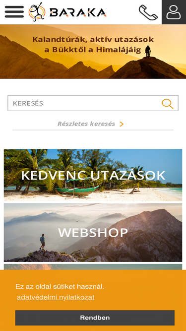 86%Baraka kalandtúrák, gyalogtúrák, aktív pihenés 1996 óta. Válassz a több, mint 100 féle kalandból: gyalogtúrák, vízi-és kerékpártúrák, kalandnyaralások belföldön és a világ számos pontján.