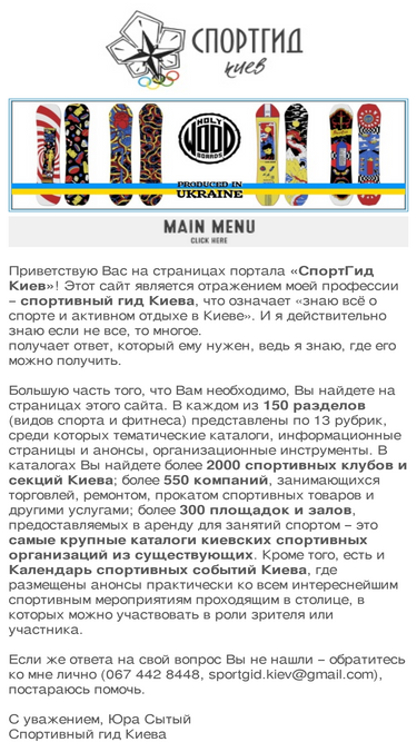 100%крупнейшие каталоги спортивных секций, клубов, тренеров, магазинов, залов киева. соревнования, анонсы, спарринги, туры, правила и многое другое.