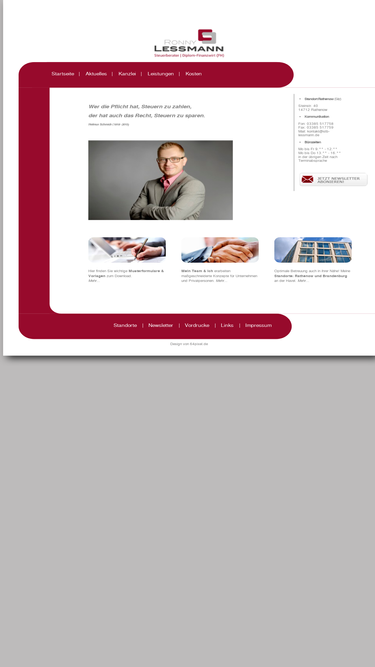 herzlich willkommen auf der internetseite des dipl. finanzwirt (fh) steuerberater ronny lessmann. hier finden sie informationen zum thema steuerberater, steuerberatung, stb, steuer, steuern, lessmann, rathenow, brandenburg, rhinow, premnitz, steuererklärungen, steuererklärung, jahresabschluss, bilanzen, exsistenzgründer, existenzgründung, buchhalter, buchhaltung, existenzsicherung, sanierung, fördermittelberatung, unternehmensnachfolge, finanzplanung, frühwarnsysteme, choaching, buisnissplan.