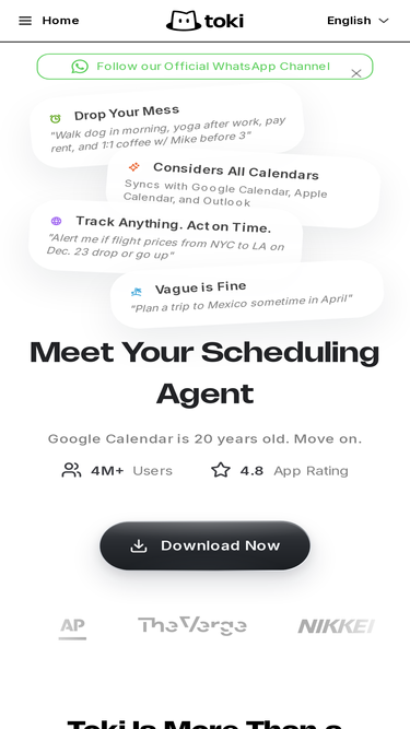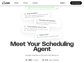 68%Toki: a powerful AI calendar assistant manages your calendar with the power and speed of AI. Using our app or your favorite messaging app like WhatsApp, Toki manages your time through voice, texts, and images. You can also sync Toki with your Google Calendar, Apple Calendar, and Outlook.
