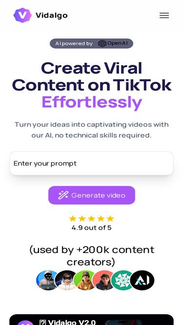 100%Experience effortless video creation with Vidalgo! Our platform empowers you to produce stunning vertical videos for TikTok, YouTube Shorts, and Instagram Reels in just one click. Start creating today and make your content stand out!