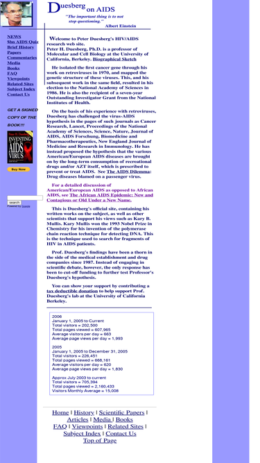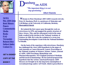 infectious aids - have we been misled? this is the official hiv/aids research from the university of california berkeley, department of molecular and cell biology. this contains the written research works of professor peter h. duesberg on the subject, as well as other scientists that support his views, such as kary b. mullis, and professor walter gilbert - both nobel prize winners (kary mullis won the 1993 nobel prize in chemistry for his invention of the polymerase chain reaction technique, for detecting dna, which is used to search for fragments of hiv in aids patient. walter gilbert, professor in molecular biology, won the 1980 nobel prize in chemistry. this outstanding site includes scientific papers, articles, and a full text search index.