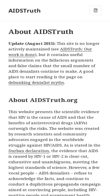 100%August 2015 AIDSTruth began in 2006 to provide accurate information that countered the nonsense of AIDS denialism. We have long since reached the point where we—the people who have in one way or an…