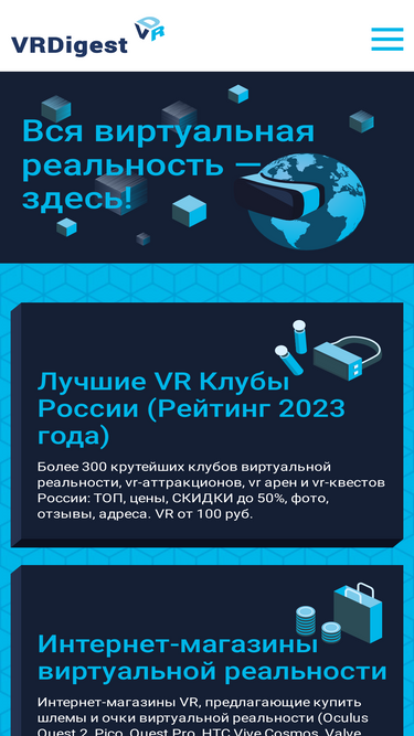vrdigest — проводник в мире виртуальной реальности. если вы решили приятно провести время и посетить vr-клуб, у вас родилась идея купить шлем виртуальной реальности или даже созрел план открыть vr-аттракцион или создать крупномасштабный бизнес-проект в сфере виртуальных технологий — тогда вы пришли «по адресу». для того чтобы сделать правильный выбор и сэкономить кучу полезного времени, мы объединили массу полезной информации, которая поможет вам не затеряться в просторах интернета и найти то, что нужно. желаем удачи!
