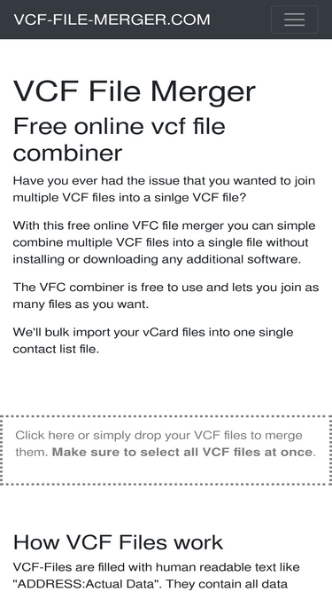 simple combine your vcard files into a single contact list file to easily import it into outlook or google contacts. no downloads required.