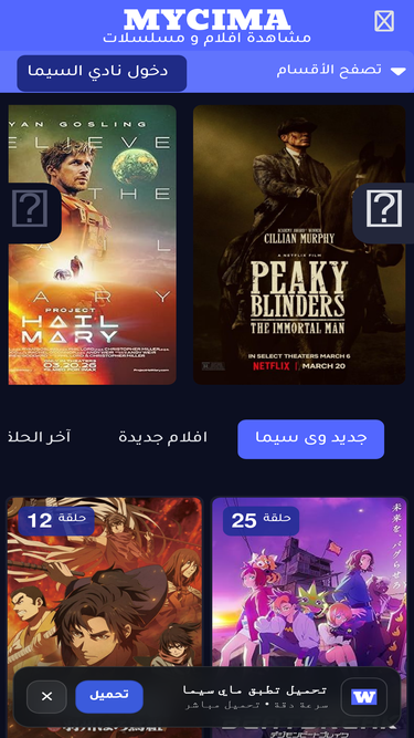 87%Mycima أكبر مكتبة عربية من الأفلام والمسلسلات المترجمة. أكثر من 18,697 فيلم و7,755 مسلسل بجودة عالية HD للمشاهدة والتحميل مجاناً. أفلام عربية وأجنبية، مسلسلات تركية وهندية، أنمي مترجم.
