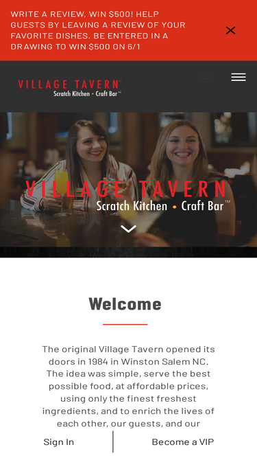 84%Village Tavern in Alpharetta, GA. Established in 1984, Village Tavern is an upscale casual American Scratch Kitchen and Craft Bar. Featuring craft cocktails, local beers, award-winning wine list and a menu full of scratch made dishes from burgers, tacos and pizzas to fresh fish and steaks.