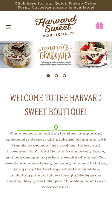 Harvard Sweet Boutique, with our storefront located at 25 South St. in Hudson, Mass., offers cakes, desserts, and custom-built gift baskets for special occasions. Shipping is available nationwide, and includes corporate gifts, care packages, and all occasion gifts wrapped in beautiful & whimsical packaging.