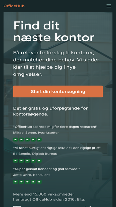vi matcher dig eller din virksomhed med det rette kontor eller kontorfællesskab. det er gratis og uforpligtende. søg blandt +130 steder i københavn og omegn.