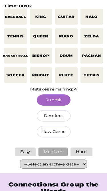 79%Play the Connections game! Connections is a game where you have to group words by topic. A new Connection puzzle is available every day!