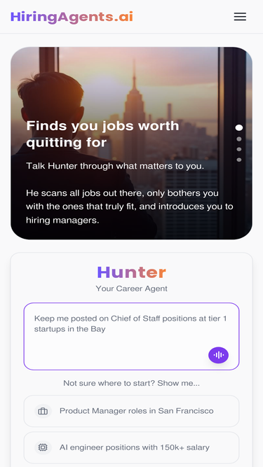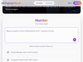 91%Agentic AI hiring platform. Intelligent career services for candidates. Free AI top of funnel tooling and cheap automated sourcing for companies.