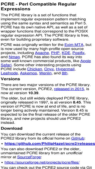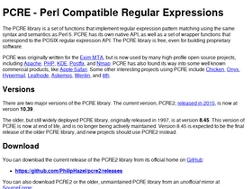 100%the pcre library is a set of functions that implement regular expression pattern matching using the same syntax and semantics as perl 5. pcre has its own native api as well as a set of wrapper functions that correspond to the posix regular expression api.