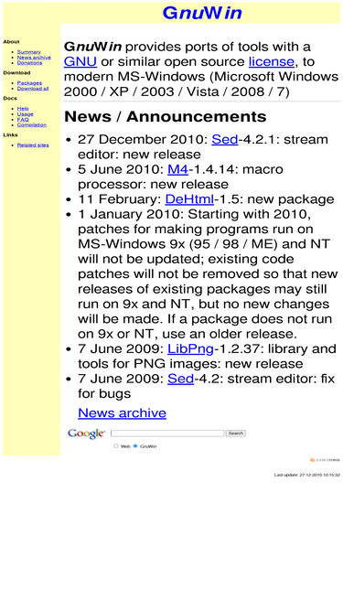 99%gnuwin32 provides win32 (ms windows 95 / 98 / me / nt / 2000 / xp / 2003 / vista / 2008) ports of tools with a gnu or similar open source license.