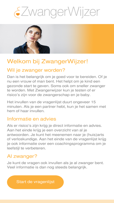 69%hebben jullie een kinderwens? voor je zwanger wordt kun je veel doen om je kind een gezonde start te geven. vul de vragenlijst in en krijg advies.